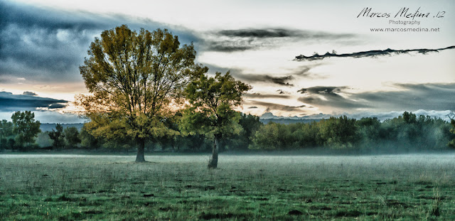 Con la primera fotografía en color tenemos un ambiente de calidez bucólica de puesta de Sol, mientras que la segunda en B&N se muestra fría y algo tenebrosa.