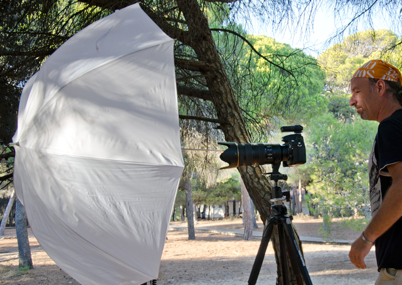 | Preparando la iluminación. Aproveche la tardía luz del Sol que se metía entre los árboles para el contra y dos paragüas para iluminar a Carolina limpiamente. Fotografía Darío Medina |