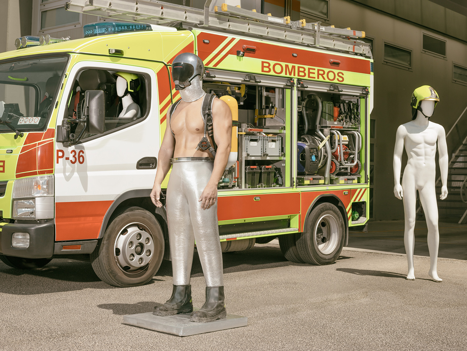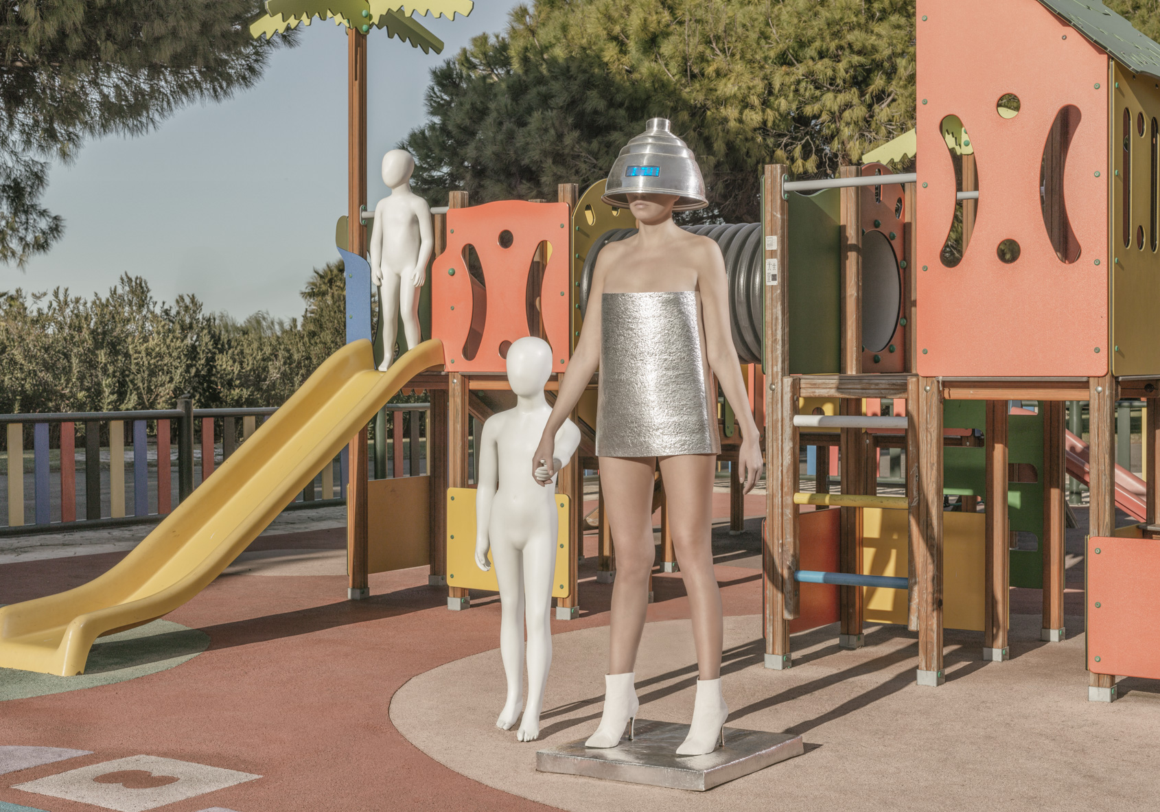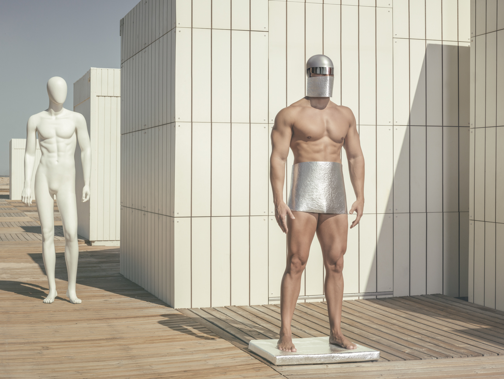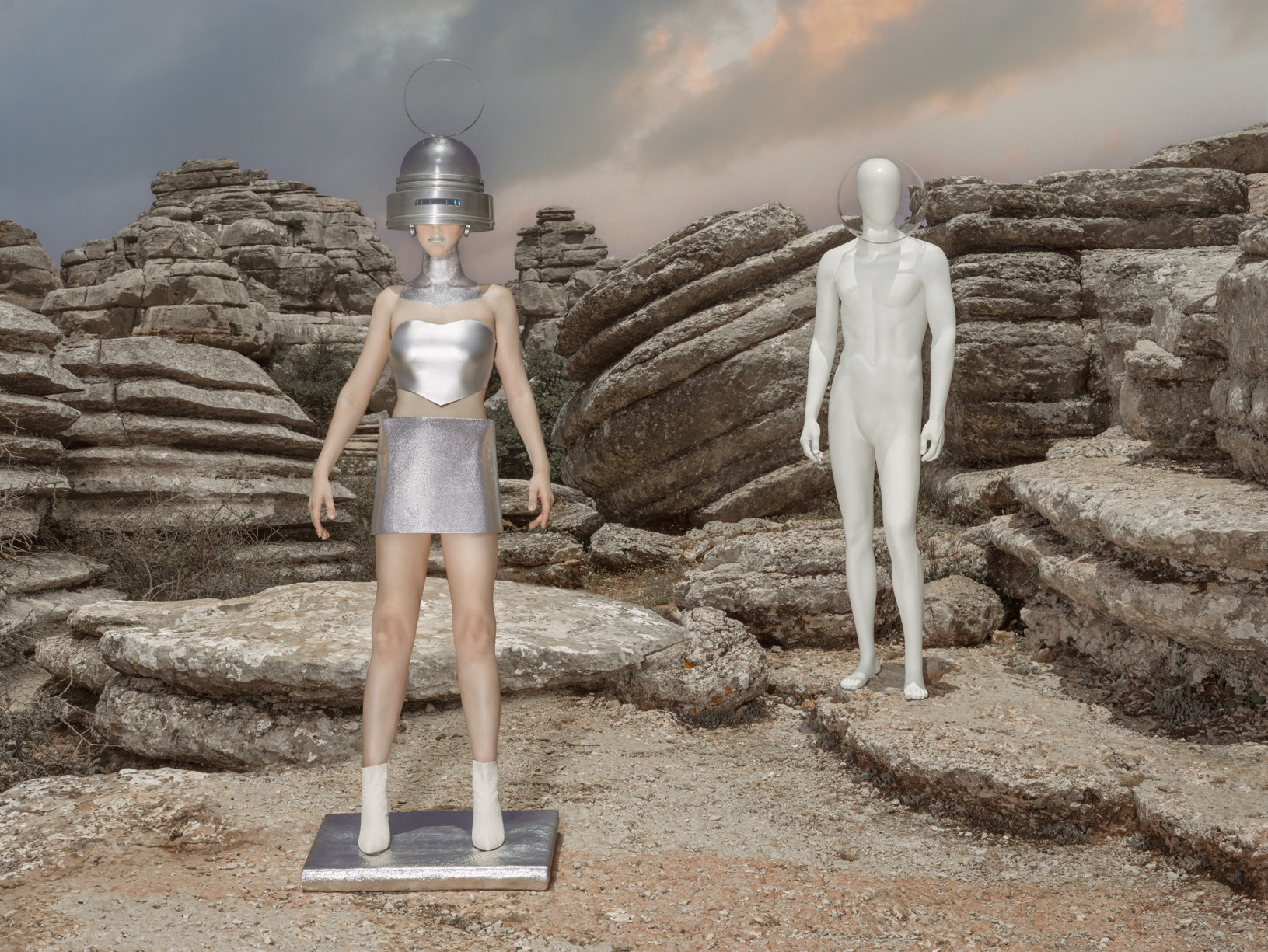 Los maniquíes, desprovistos de rasgos, encarnan la pérdida de singularidad y la reducción del individuo a un objeto intercambiable. Su anonimato funciona como metáfora de una humanidad que se diluye en estructuras cada vez más mecanizadas. En contraposición, los modelos de aspecto androide representan la presencia invasiva, eficiente y aparentemente perfecta de la IA, cuya influencia se expande tanto en la vida social como en los ámbitos profesionales.